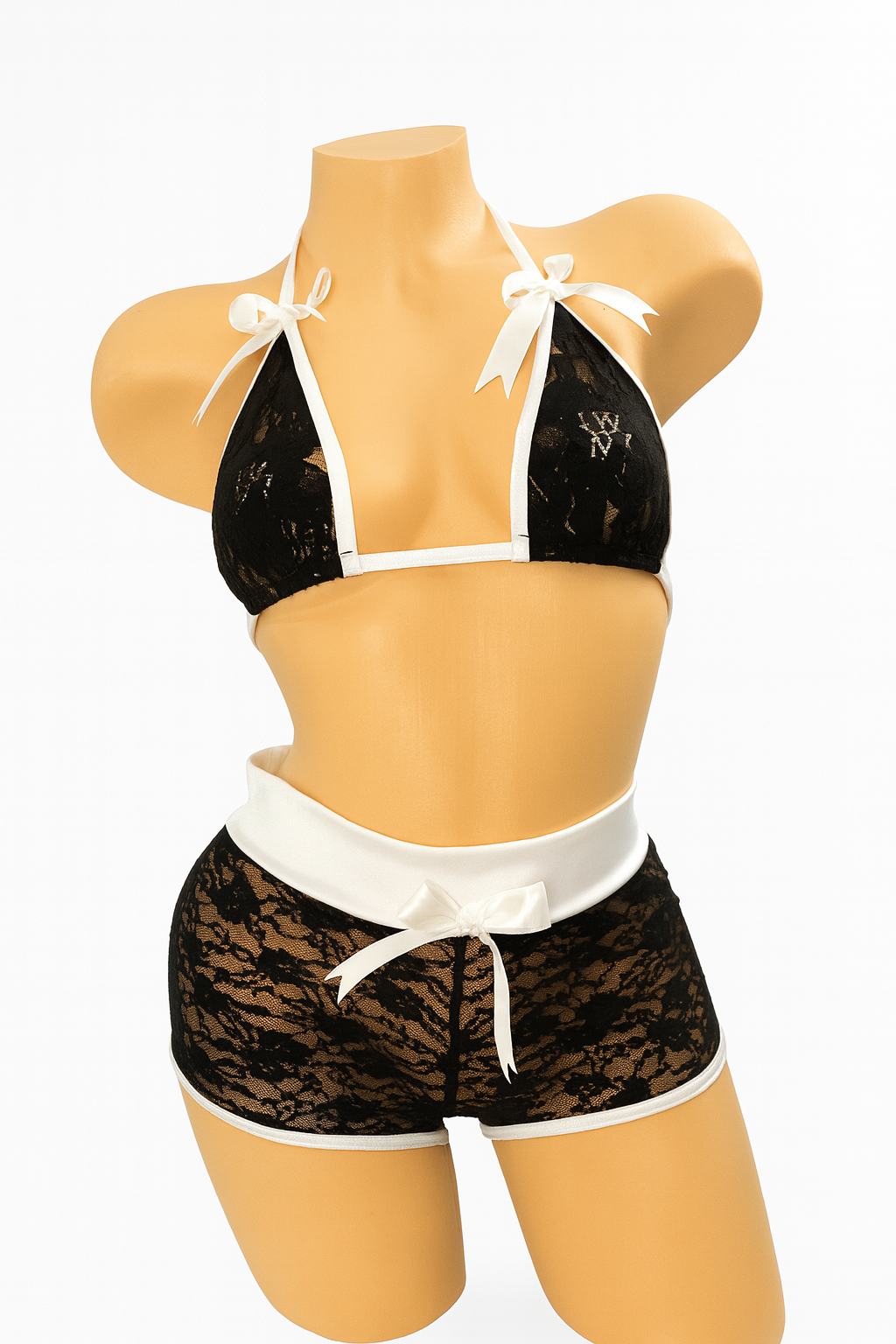 Innocence with a wicked twist. Sin & Satin pairs delicate white satin details with bold black lace, creating the perfect balance of angelic sweetness and seductive edge.